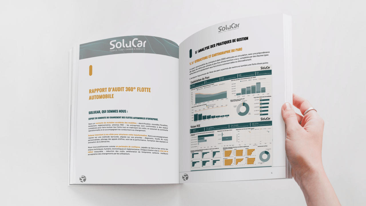 UNE ÉVALUATION STRATÉGIQUE POUR MIEUX GERER La gestion d’une flotte automobile implique bien plus que le simple suivi des véhicules. Elle repose sur un ensemble complexe de données, d’outils, de process, de budgets et de décisions stratégiques. Avec l’audit de flotte automobile Solucar, vous bénéficiez d’une analyse complète et structurée couvrant l’ensemble des leviers : base & outils, parc & process, budget & finance, et stratégie d’achat. Cet audit global permet d’évaluer la performance de votre flotte à tous les niveaux, du véhicule individuel à la gouvernance stratégique, et d’en dégager un plan d’action concret et hiérarchisé pour optimiser durablement vos coûts et votre politique mobilité. 33% People 33% Planet 33% Profit POURQUOI RÉALISER UN AUDIT DE FLOTTE AUTOMOBILE ? Dans un contexte de transformation du marché automobile, de fiscalité mouvante et d’exigences RSE croissantes, l’audit de flotte devient un outil essentiel de pilotage. Solucar vous aide à piloter efficacement votre parc, à sécuriser vos contrats et à anticiper les évolutions de mobilité. Identifier les leviers d’optimisation des coûts Sécuriser vos investissements véhicules et contrats Adapter votre stratégie aux nouvelles mobilités Identifier les leviers d’optimisation des coûts Grâce à une approche globale, nous analysons toutes les composantes du coût total de possession (TCO) : financement (LLD, LMD, LCD, achat, crédit-bail), entretien, carburant, fiscalité, sinistralité et émissions. L’objectif étant de révéler tous les gisements d’économie, qu’ils soient liés aux process internes, aux outils de gestion, à la politique d’achat ou à la composition du parc automobile. Sécuriser vos investissements véhicules et contrats Les engagements financiers liés aux véhicules représentent souvent des montants importants pour une entreprise. Nous vérifions la cohérence économique de vos contrats, la pertinence des durées, les coûts cachés et les risques à la restitution. Nous assurons aussi la fiabilité des données de suivi et la traçabilité des budgets, afin que chaque décision repose sur une information juste et actualisée. Adapter votre stratégie aux nouvelles mobilités L’audit de flotte ne se limite plus à une approche financière. Il intègre la mobilité durable, l’électrification du parc et la digitalisation des outils de gestion. Nous vous accompagnons pour évaluer la faisabilité de l’électrique, simuler les impacts du mix énergétique et aligner vos choix avec vos objectifs RSE. Cette approche globale permet de redéfinir votre stratégie mobilité : plus agile, plus verte et plus efficiente. Les bénéfices d’un audit de flotte pour votre entreprise Un audit de flotte automobile complet, c’est avant tout un levier de pilotage stratégique. Il vous permet de mieux gérer, mieux investir, et mieux décider. Réduction du coût total de possession En croisant les données issues de vos contrats, factures, outils et historiques, nous mettons en évidence les postes de coûts les plus lourds et proposons des actions correctrices chiffrées. Nos analyses permettent souvent de réduire le TCO global grâce à des optimisations ciblées : – Ajustement des durées de LLD – Rationalisation du parc – Optimisation de l’entretien et des sinistres – Redéfinition des process internes Meilleure maîtrise du parc automobile L’audit offre une vision claire et consolidée de votre parc : composition, âge moyen, kilométrage, taux de rotation, sinistralité et plan d’entretien. En combinant données terrain et analyse process, Solucar vous aide à rendre votre parc plus fiable, plus performant et mieux piloté. L’intégration d’outils digitaux adaptés renforce encore votre efficacité opérationnelle. Alignement entre objectifs RSE et politique mobilité Intégrer la dimension environnementale est aujourd’hui indispensable. L’audit de flotte Solucar vous aide à évaluer la cohérence entre votre politique automobile et vos engagements environnementaux. Nos experts vous accompagnent dans la mise en œuvre d’une politique mobilité durable, alignée sur vos engagements RSE et la réglementation (ZFE, bonus-malus, fiscalité…). Méthode Solucar : Un audit structuré en 3 volets Chaque entreprise est unique. C’est pourquoi Solucar a développé une méthode d’audit modulaire et personnalisée, articulée autour de trois axes complémentaires. CAR : État et performances de vos véhicules PLATFORM : Outils, données et process de gestion DRIVER : Comportement des conducteurs et usages CAR : État et performances de vos véhicules Ensemble, nous observons la réalité terrain : âge moyen du parc, typologie des véhicules, kilométrages, coûts d’entretien, sinistralité et conformité réglementaire. Nous réalisons un diagnostic complet pour repérer les écarts de performance, identifier les dérives de coûts et déterminer les leviers d’amélioration à activer. PLATFORM : Outils, données et process de gestion Nous étudions votre environnement de gestion : bases de données, logiciels, tableaux de bord, procédures internes et interactions entre services. L’objectif est clair : fiabiliser les données, fluidifier les échanges et assurer la cohérence entre vos outils et votre stratégie. C’est ensemble que nous posons les fondations d’un pilotage solide et durable. DRIVER : Comportement des conducteurs et usages Parce que les usages de vos collaborateurs influencent directement les coûts, nous analysons les comportements de conduite, la gestion des véhicules de fonction et la sécurité routière. Nous vous accompagnons ensuite dans la mise en place d’actions concrètes : formation, sensibilisation et programmes d’éco-conduite pour améliorer durablement la performance de votre parc. Restitution, votre Fleetboard personnalisé Une fois l’audit réalisé, Soluca